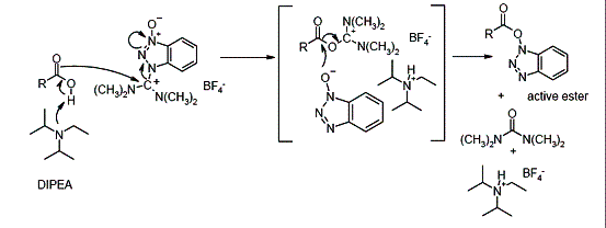 鎓鹽型縮合試劑反應(yīng)活性高,速度快,現(xiàn)在使用非常廣泛,主要包括:HBTU,TBTU,HATU,PyBOP等。該試劑使用過程中需要添加有機(jī)堿,如,二異丙基乙胺(DIEA),N-甲基嗎啉(NMM),該試劑加入后,才能活化氨基酸。其反應(yīng)機(jī)理如下: