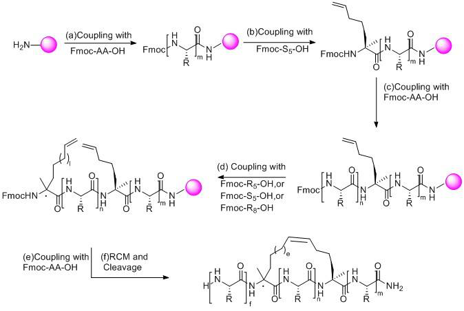 訂書肽的合成與普通多肽合成的區(qū)別在于在固相合成肽鏈過程中引入兩個含有α-甲基,α-烯基的非天然氨基酸,然后兩個非天然氨基酸之間發(fā)生烯烴復(fù)分解反應(yīng)環(huán)化構(gòu)成穩(wěn)定α-螺旋結(jié)構(gòu)構(gòu)象的全碳支架,進(jìn)而合成訂書肽。